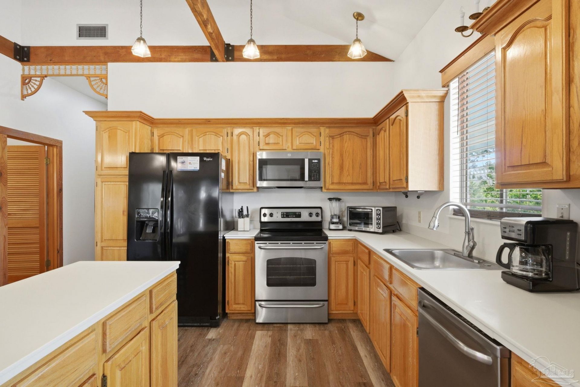 Beautiful Caribbean-style home in the quiet, off-the-beaten-path Surfside Shores community. Situated on a large corner lot, this home features high ceilings, LVT flooring, and a bright open layout with stainless steel kitchen appliances. Enjoy the shaded wraparound balcony-perfect for relaxing after a day at the beach. Underneath the house is a large workshop plus a convenient third bathroom for easy cleanup after beach days or cookouts. Surfside Shores is a golf cart and pet-friendly neighborhood. Turn-key and rent-ready or ideal as a full-time residence. Buyer to verify all information during due diligence.