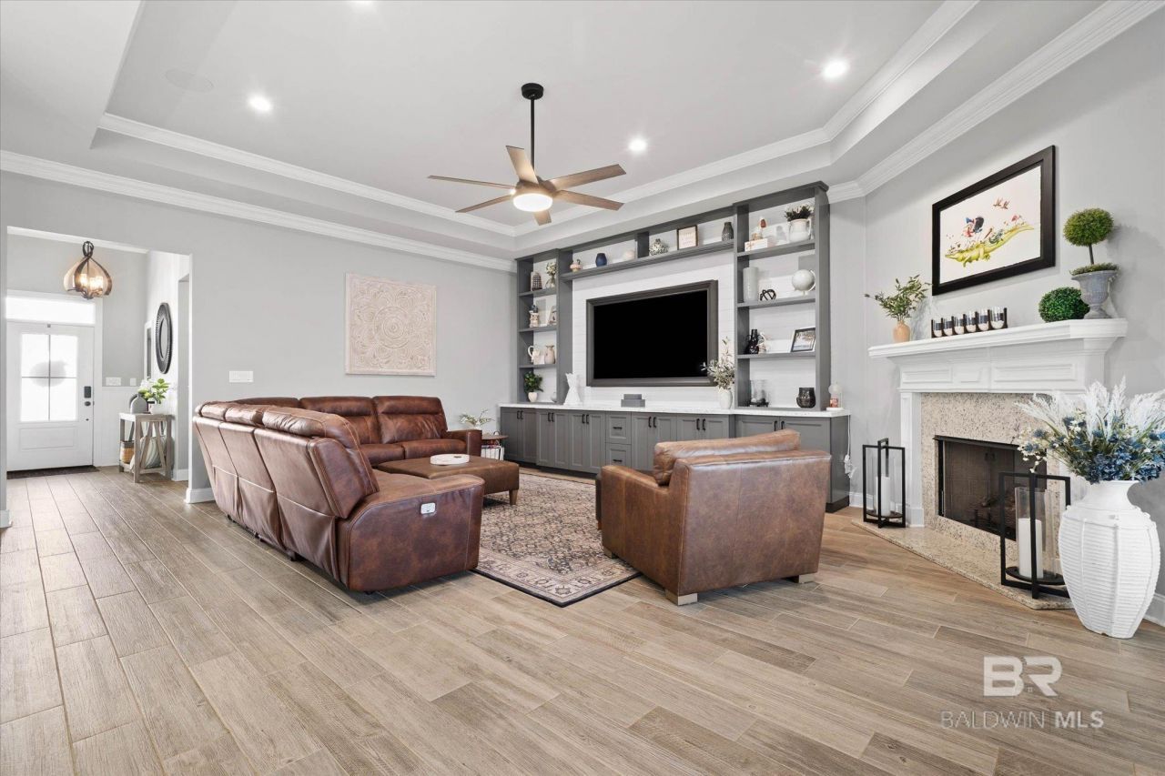 Better than new construction because all the upgrades are already done. Skip the wait, the construction delays, and the extra upgrade costs. This beautifully maintained 4-bedroom, 3-bath home with a dedicated office is move-in ready and packed with features buyers often have to add later when building new. Inside, the open living space showcases custom built-in entertainment centers in both the living room and primary bedroom, crown molding throughout, custom accent walls, updated lighting, and smart switches throughout the home for modern convenience. The kitchen is finished with quartz countertops, under-cabinet lighting, and updated appliances including a new microwave and dishwasher (2025). Ceiling fans and thoughtful upgrades create a comfortable and stylish living space throughout. The spacious primary suite features custom built-ins, a custom bed, and additional cabinetry in the primary bath for enhanced storage and functionality. Bedrooms feature LVP flooring, and the home also includes a whole-house water filtration system and a 16-channel security system with seven wired cameras. Step outside to a fully finished backyard retreat that would cost tens of thousands to add to new construction. Enjoy a swimming pool, pergola, extended patio, screened-in patio with ceiling fans, and a built-in Weber gas grill perfect for relaxing or entertaining. Additional exterior features include concrete landscape curbing, RainBird irrigation system, gutters with downspouts, a storage shed, and fresh exterior paint (2025). The garage also includes 220V power, ideal for a workshop or EV charging. This home offers the upgrades, outdoor living, and move-in convenience today that many new construction homes simply don't include. Schedule your showing and experience the difference for yourself. Buyer to verify all information during due diligence.